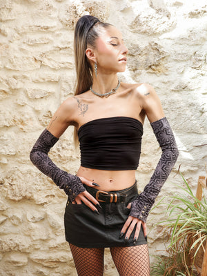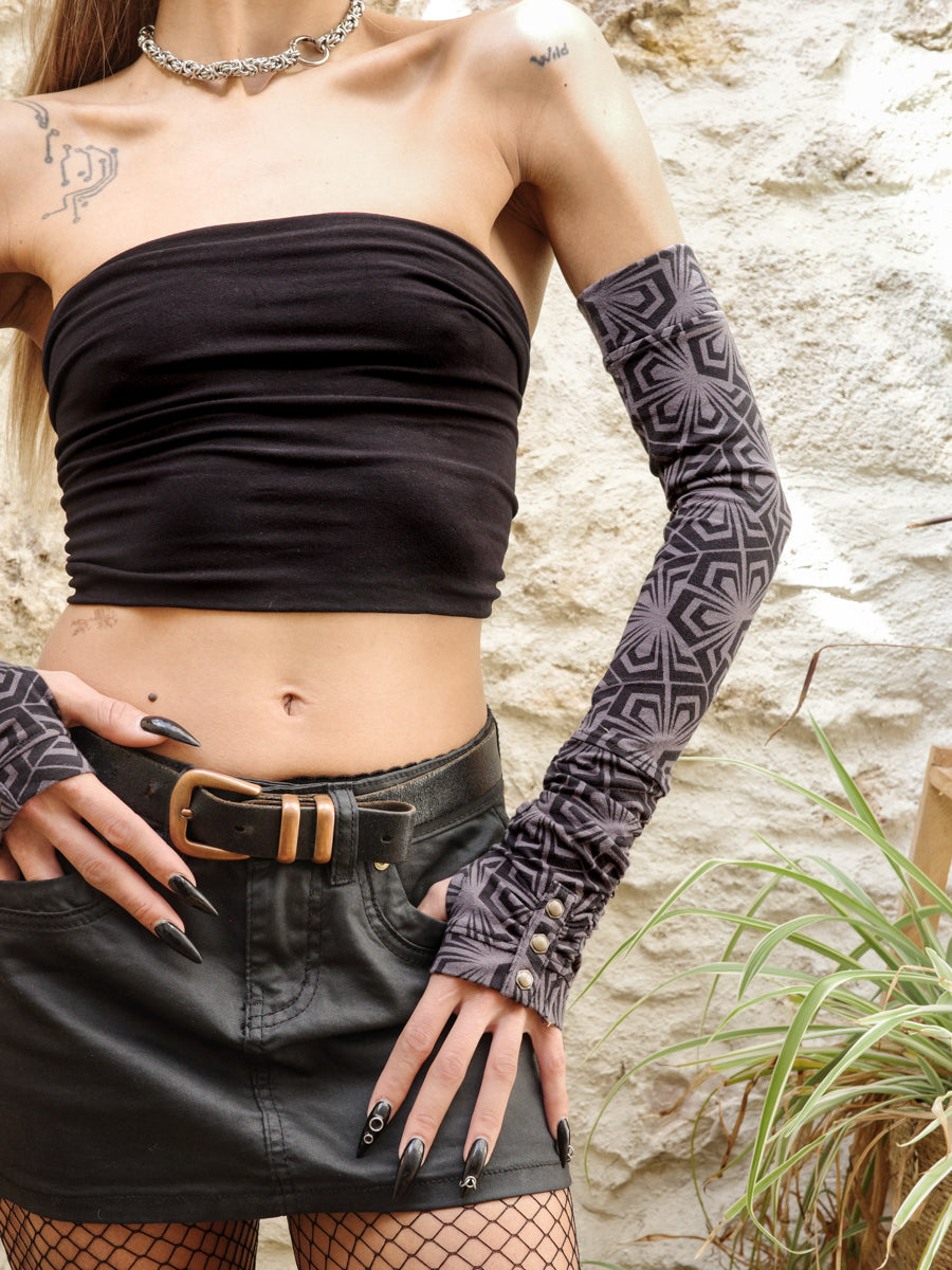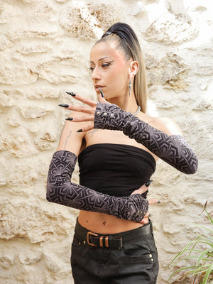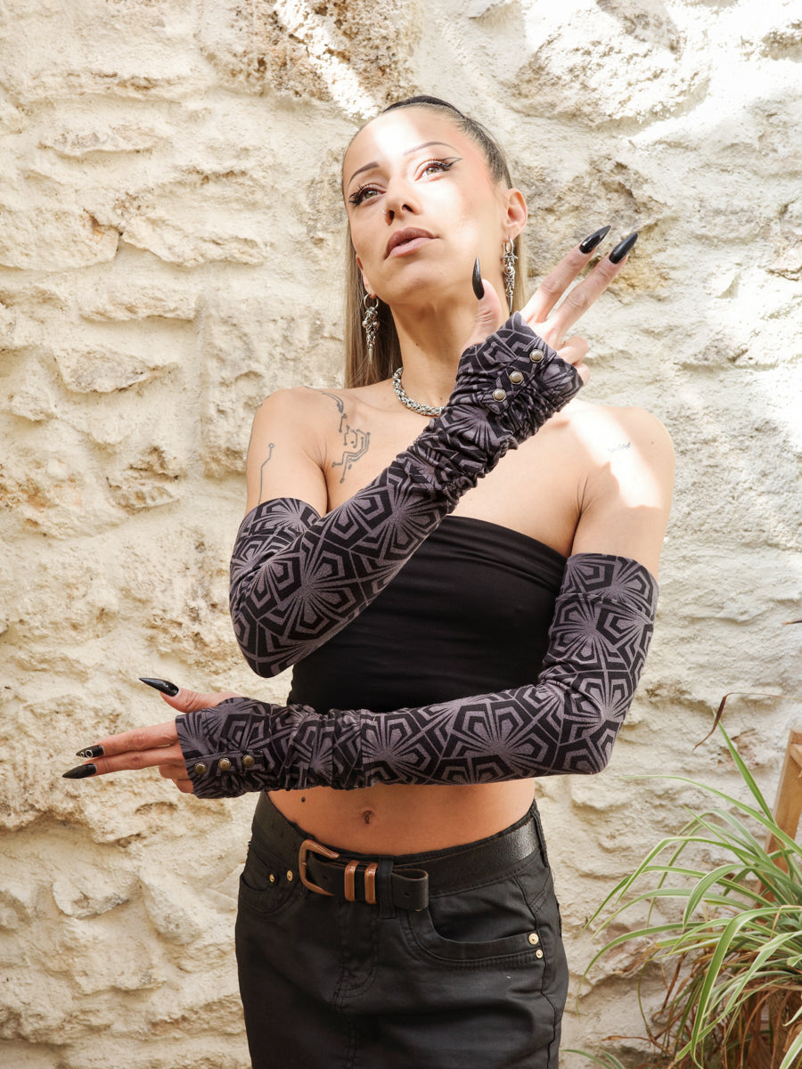Long cotton jersey mittens with thumbholes studs and geometric print - BlackBohemWear