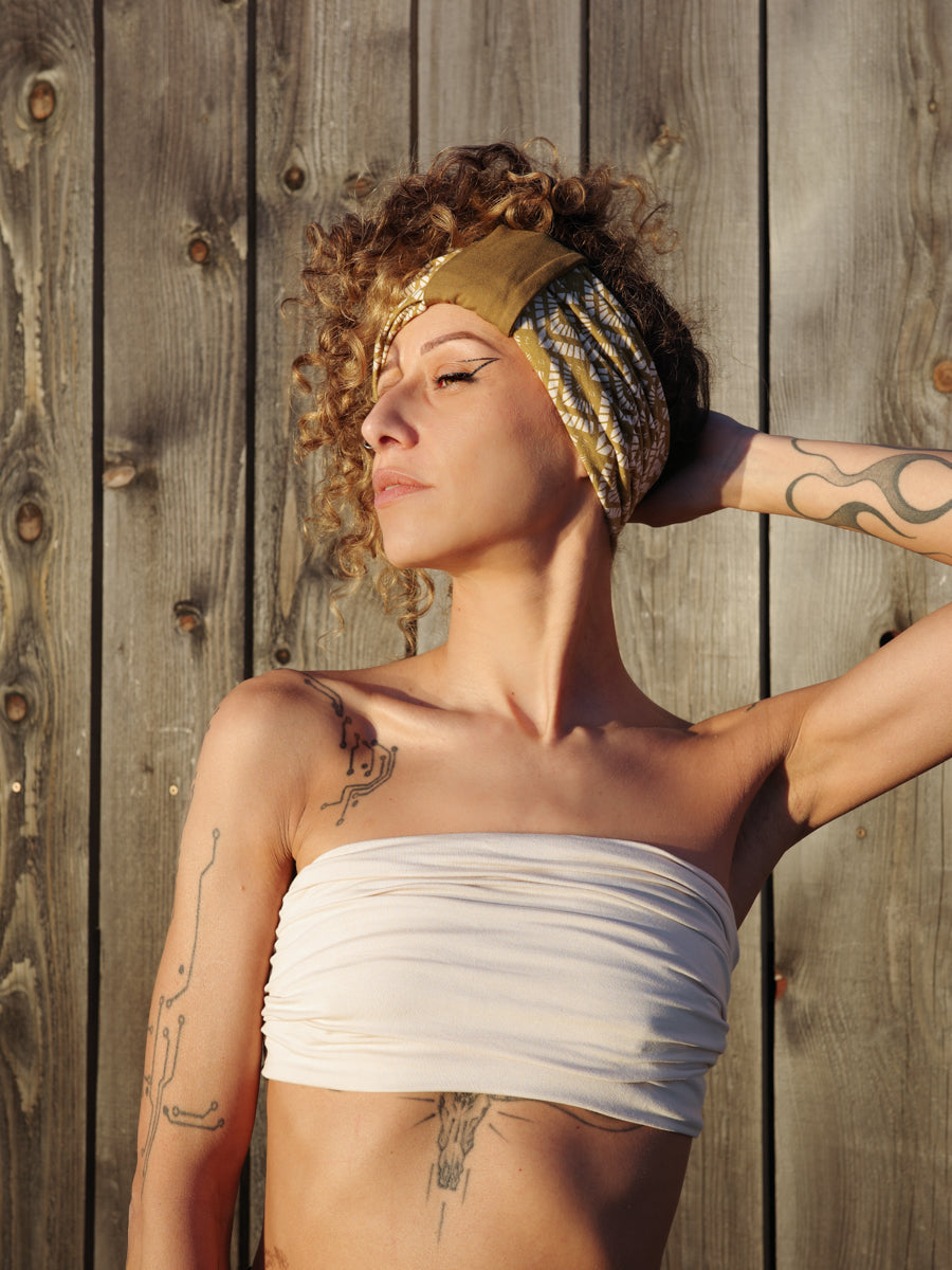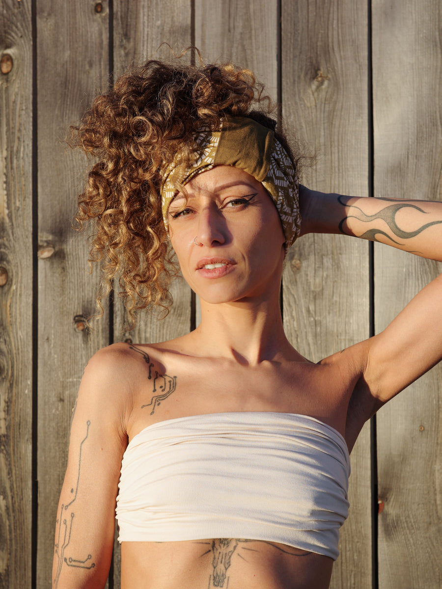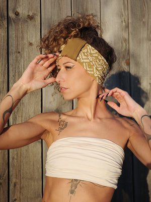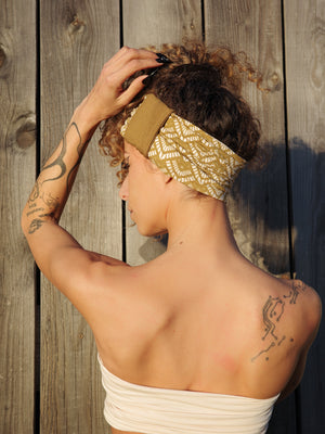 Black and mustard headband in stretchy jersey with geometric print - BlackBohemWear