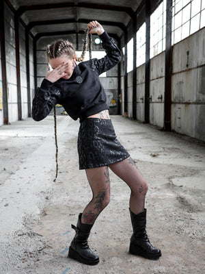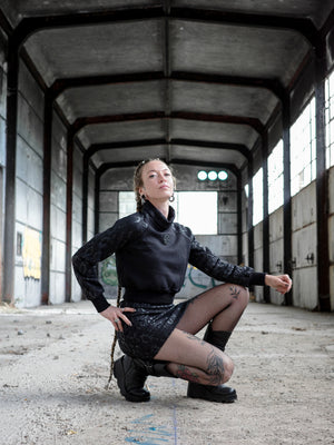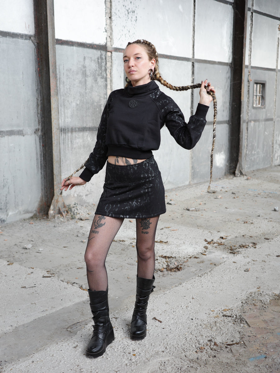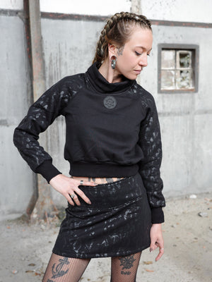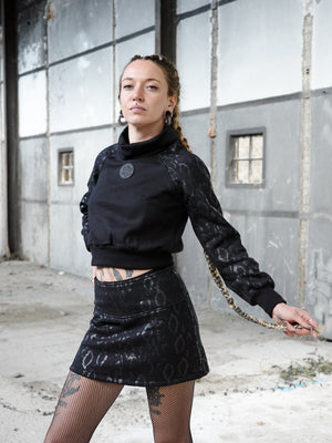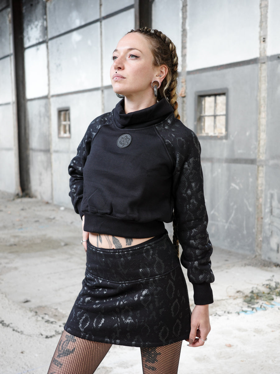 Crop sweater in black fleece (80% Cotton 20% Polyester) with a slightly puffed high lined collar and cotton RIB finish on sleeves and bottom