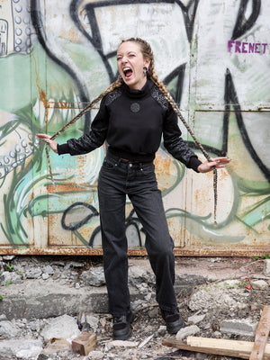 Les manches raglan, ainsi que le devant et dos sont sérigraphiés avec un superbe motif de calligraphie abstraite en noir brillant